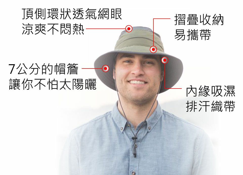 ● UPF50+ 防曬係數,可抵擋 UV99.9% 紫外線,環狀透氣系統涼爽不悶熱。